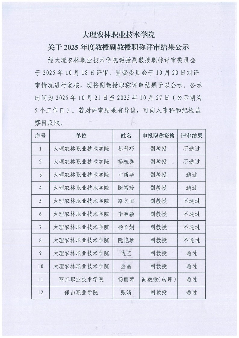 丽江职业技术学院委托大理农林职业技术学院 关于2025年度教授副教授职称评审结果公示