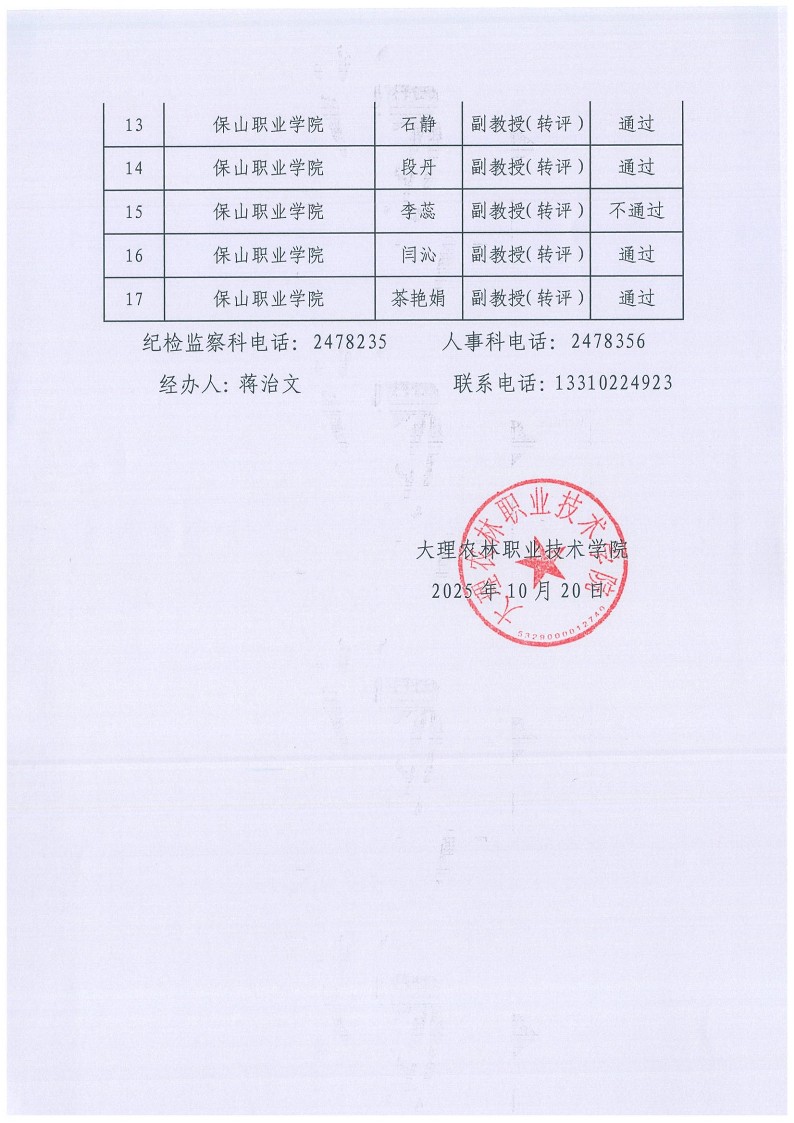 丽江职业技术学院委托大理农林职业技术学院 关于2025年度高校讲师职称评审结果公示